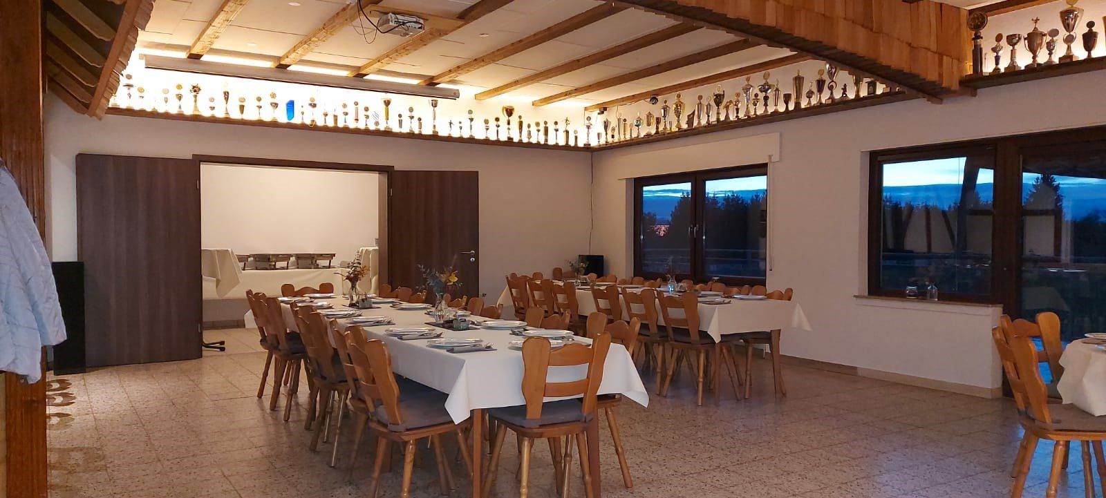 Das Sportheim bietet neben einer Vollausgestatteten Küche und Theke einen großen Balkon sowie einen separaten Raum welcher zum für ein Buffet o.ä. genutzt werden kann.